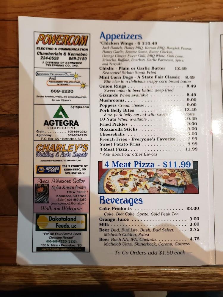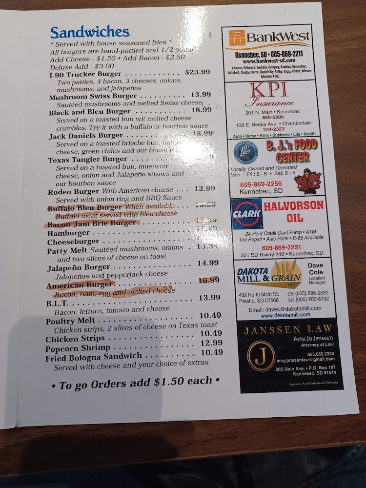 Welcome to The 605 Restaurant & Bar at Outlaw RV Park, where great food meets good times! Nestled in Kennebec, SD, our establishment offers a delightful menu featuring local specialties and a wide selection of cocktails and beers. Enjoy meals at our cozy dining area or opt for takeout. We strive to provide quick service, making every visit enjoyable, whether it's breakfast, lunch, or dinner. Please note that our kitchen typically closes at 9 PM, so call ahead to confirm hours. With wheelchair-accessible amenities and a friendly atmosphere, we look forward to serving you soon!